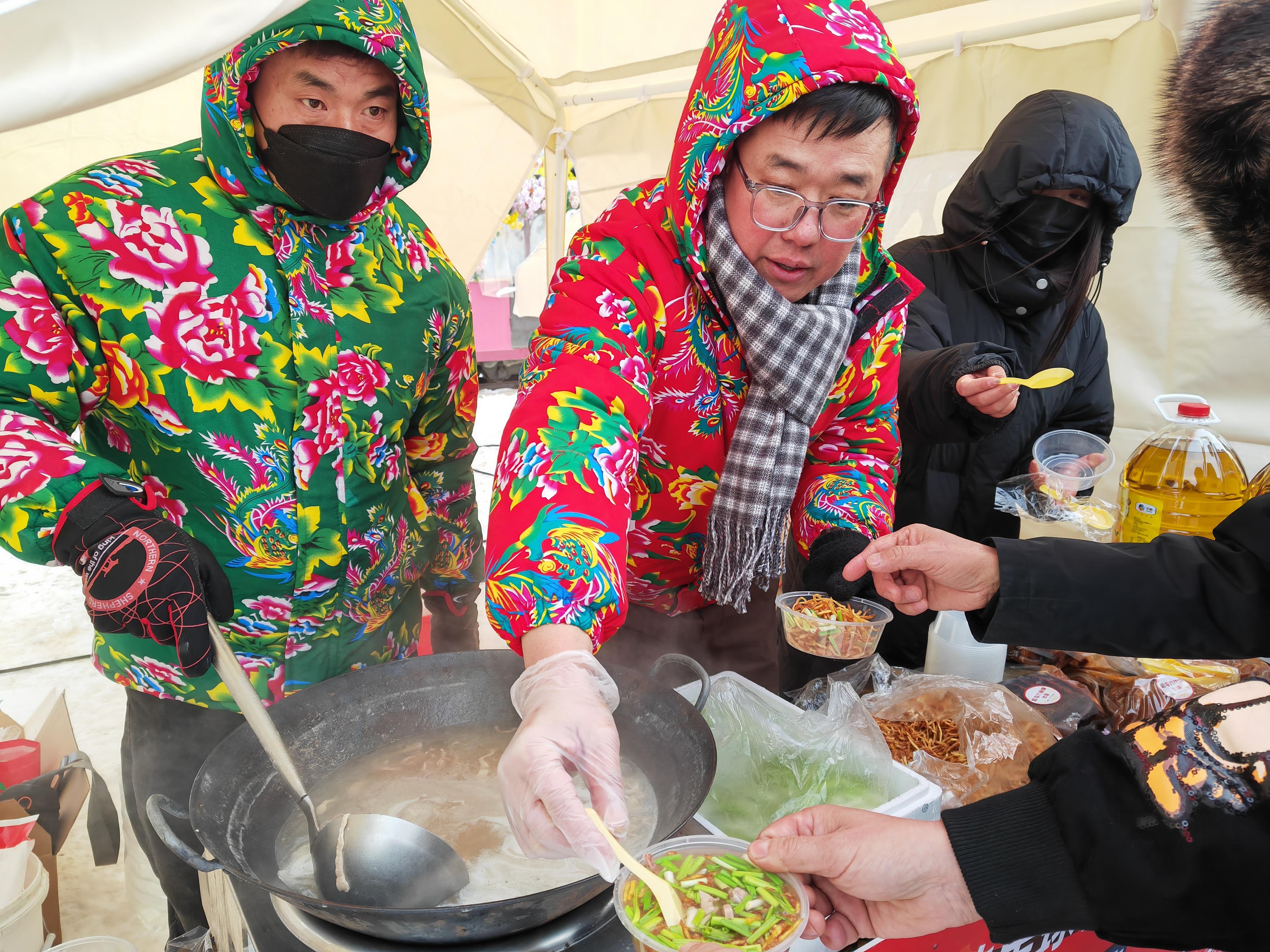 賽事開幕現(xiàn)場精心打造的興隆市集,匯聚了沈北新區(qū)多家知名餐飲企業(yè)與食品生產(chǎn)商,現(xiàn)場推出剛出鍋的大米粥、餃子、羊湯、湯圓、麻團等美食,還提供中醫(yī)藥膳、特調(diào)暖飲供大家免費試吃。起早趕場的記者隨著人群逐一逛遍各家攤位,一番品嘗后早已飽腹,在室外拍照凍紅的手也暖了起來。