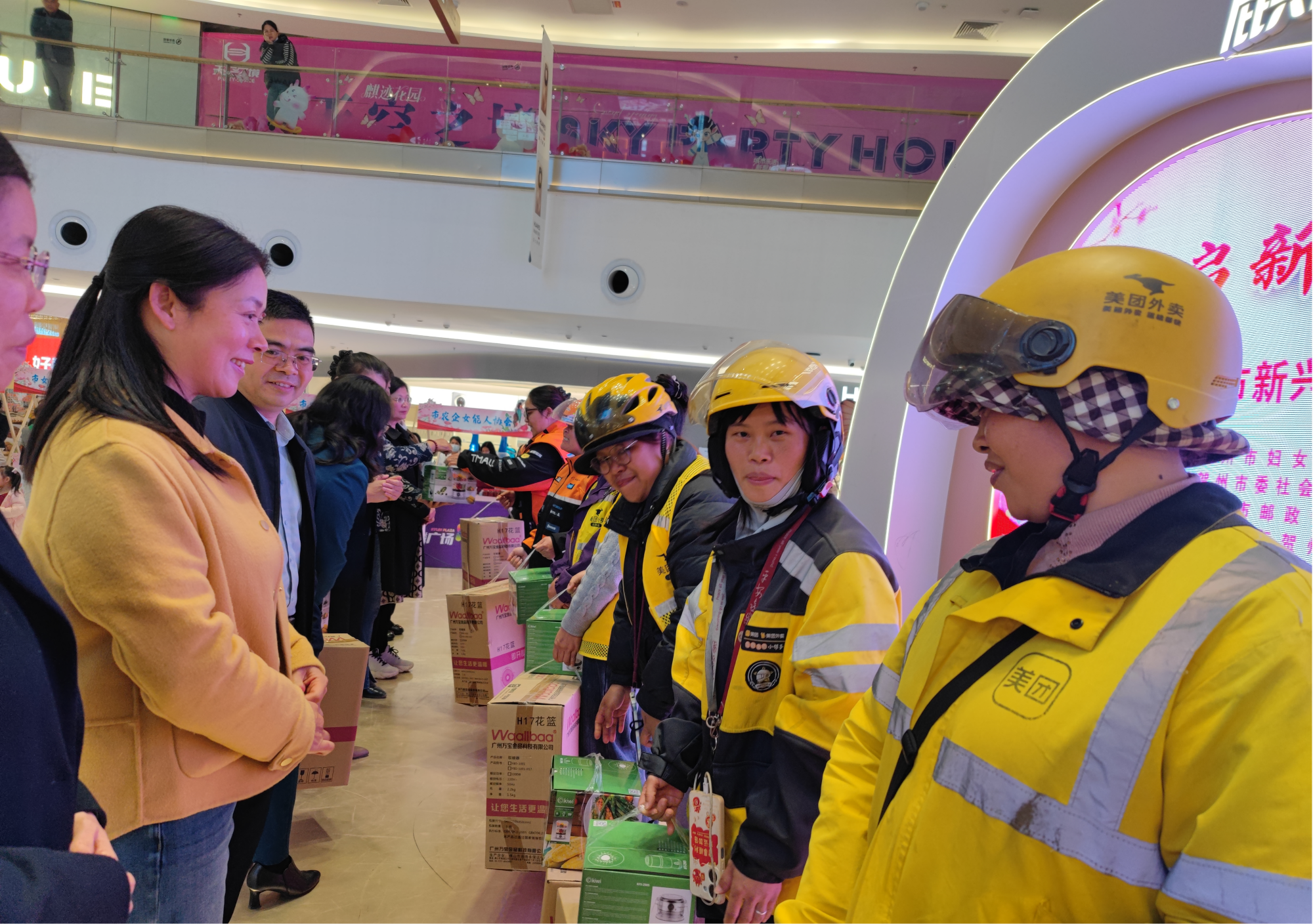 “桂姐姐”們為女外賣騎手送上暖心關(guān)懷禮包。賀州市市場監(jiān)管局供圖