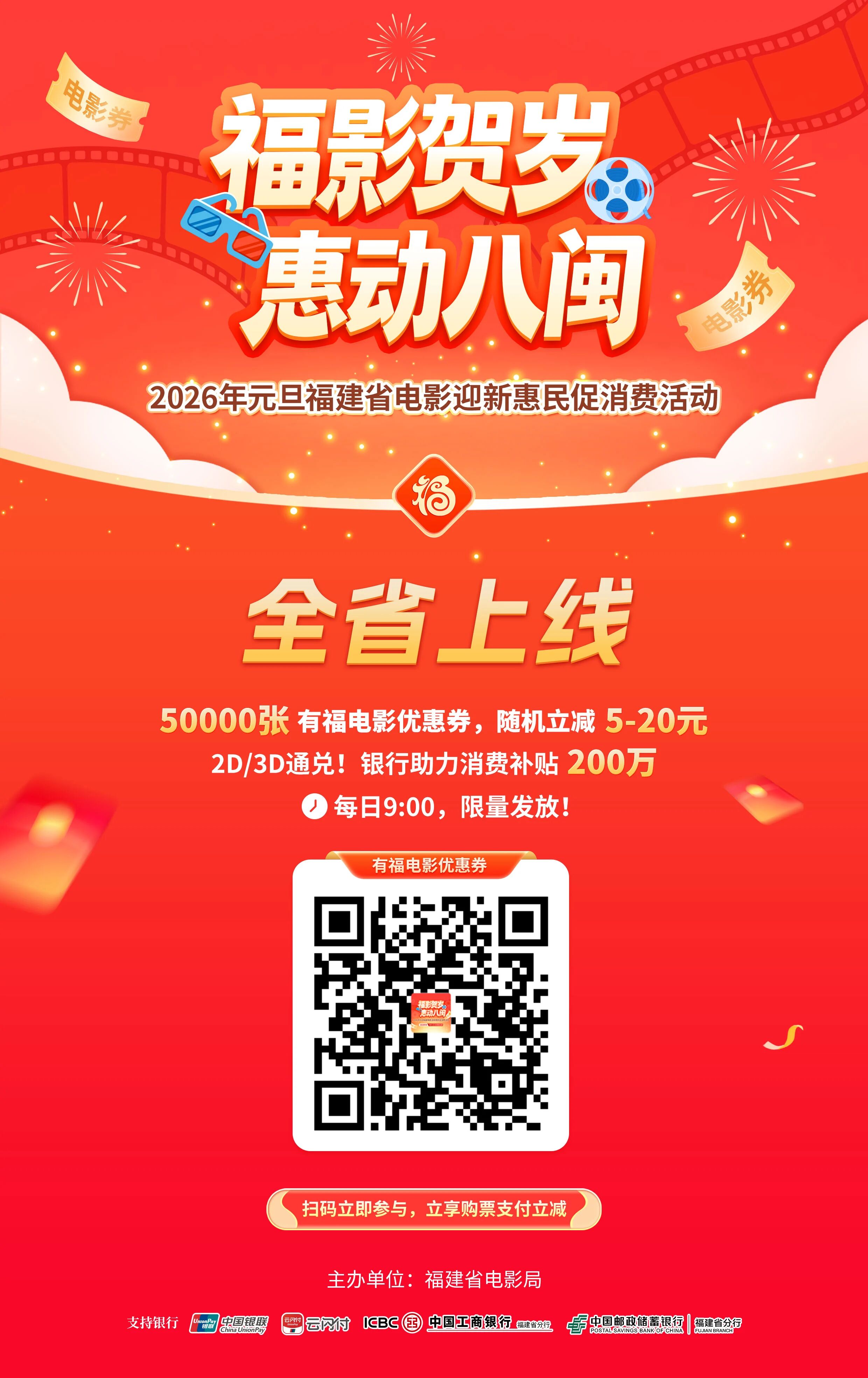 2025年12月29日至2026年3月3日,福建開展“電影迎新賀歲惠民促消費(fèi)”活動(dòng),聯(lián)合省內(nèi)電影院,面向全省觀眾集中發(fā)放15萬張“有福電影優(yōu)惠券”,活動(dòng)覆蓋元旦、春節(jié)兩大電影熱門檔期。同時(shí),聯(lián)合中國銀聯(lián)福建分公司、中國工商銀行福建省分行、中國郵政儲(chǔ)蓄銀行福建省分行同步投入超500萬元資源,疊加銀行專門立減優(yōu)惠,進(jìn)一步拓寬惠民覆蓋面與力度,激發(fā)電影消費(fèi)潛力,繁榮節(jié)日文化市場。