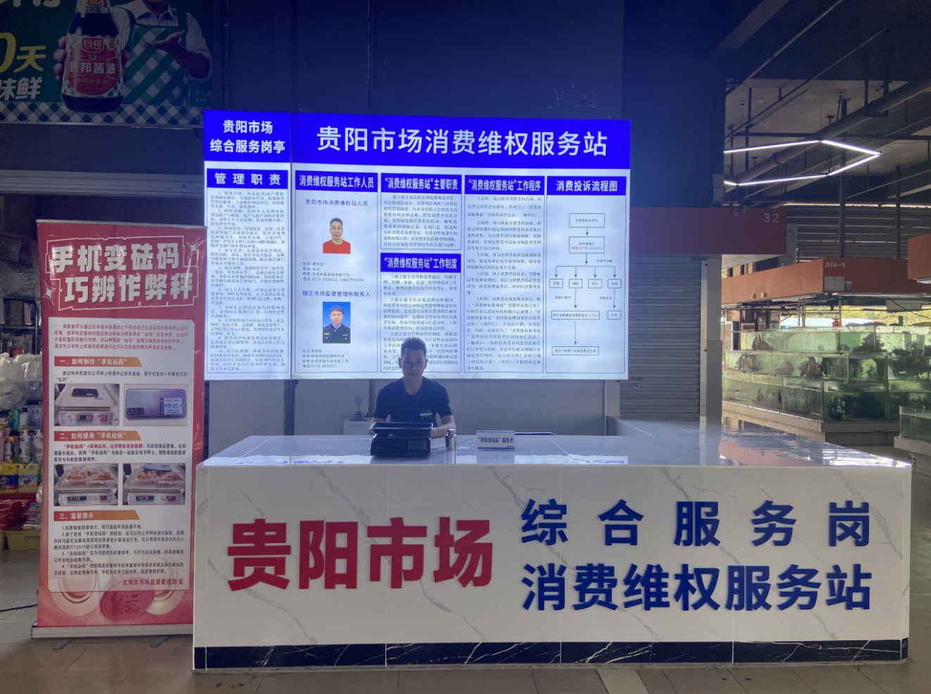 北海市一家農(nóng)貿(mào)市場(chǎng)設(shè)置綜合服務(wù)崗、“手機(jī)變砝碼”服務(wù)點(diǎn)服務(wù)消費(fèi)者。北海市市場(chǎng)監(jiān)管局供圖