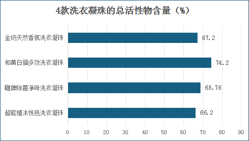 在核心去污成分總活性物含量測試中,各樣品呈現(xiàn)出顯著的產(chǎn)品類型差異??偦钚晕镒鳛橄礈飚a(chǎn)品的核心去污成分,含量越高去污效果通常越好。標(biāo)準(zhǔn)規(guī)定普通型洗衣液總活性物含量≥15%,濃縮型≥25%,而洗衣凝珠作為新型濃縮洗衣液,本次實(shí)測含量高達(dá)66.2%—74.2%,遠(yuǎn)超普通洗衣液的14.23%—21.4%,這意味著同等用量下洗衣凝珠的去污能力更具優(yōu)勢。