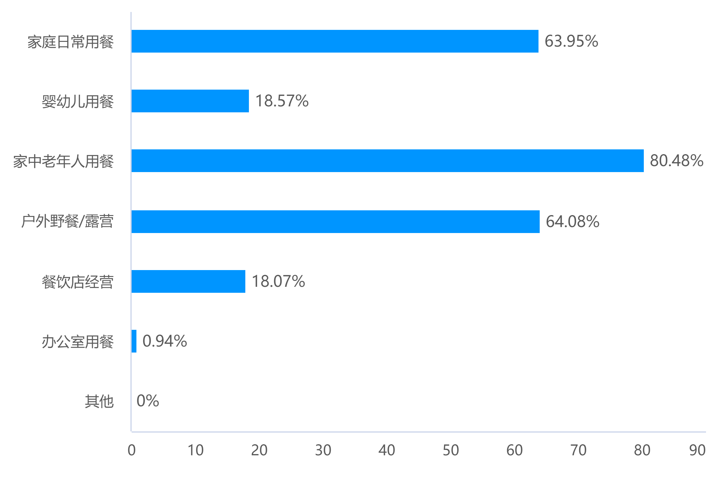 調(diào)查顯示,18歲—30歲受訪者占了94%;超97%的人都買過、用過,96.2%的受訪者表示每周會使用3次—5次。使用場景最多的是給家中老人用餐(80.48%)和日常用餐(63.95%),64.08%的人用于戶外野餐/露營,18.57%的人用于嬰幼兒用餐,還有18.07%的人群用于餐飲店經(jīng)營。
