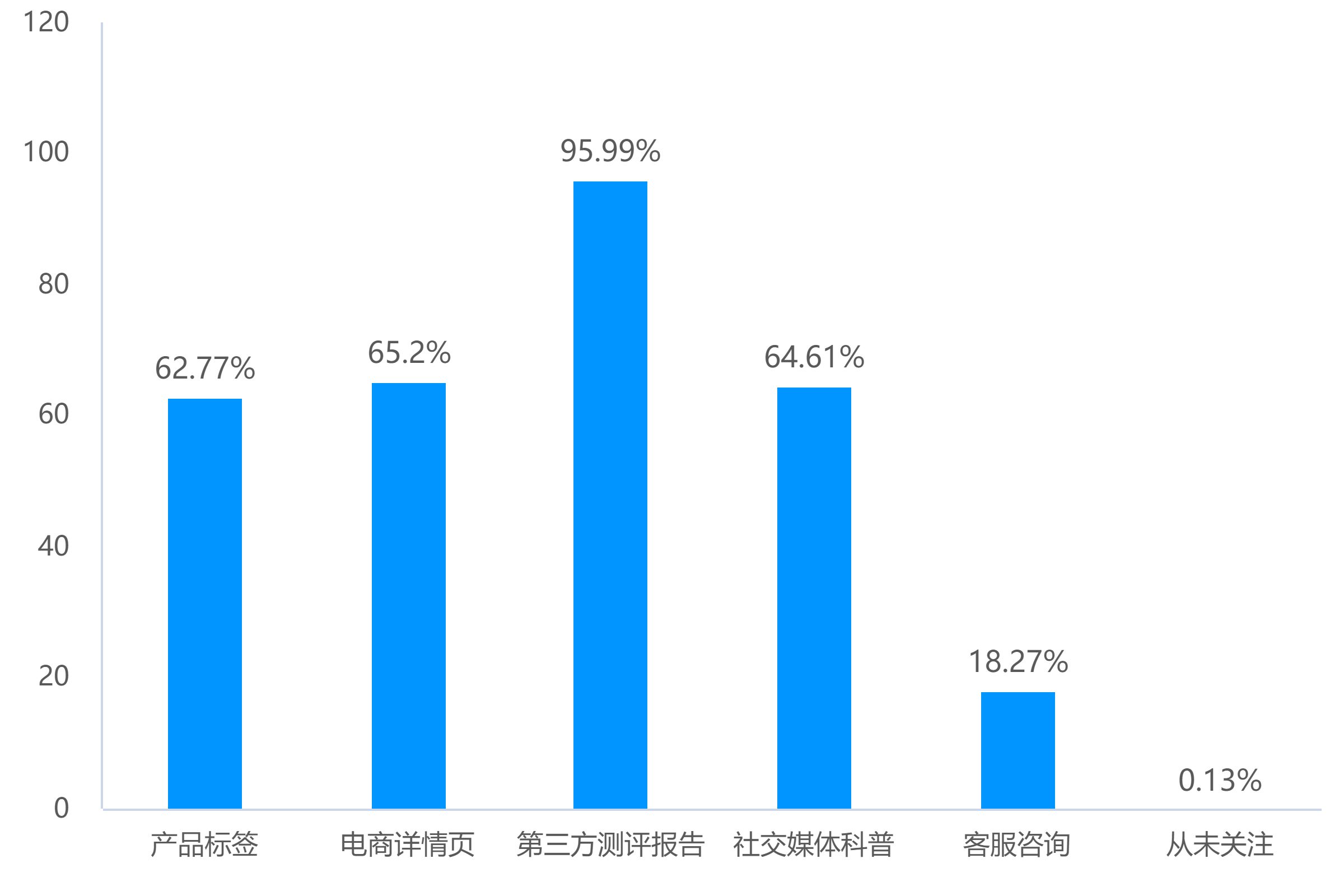 95.99%的人靠第三方測評了解安全信息,其次是電商詳情頁(65.2%)和社交媒體科普(64.61%);很少有人看產(chǎn)品標簽或咨詢客服。
