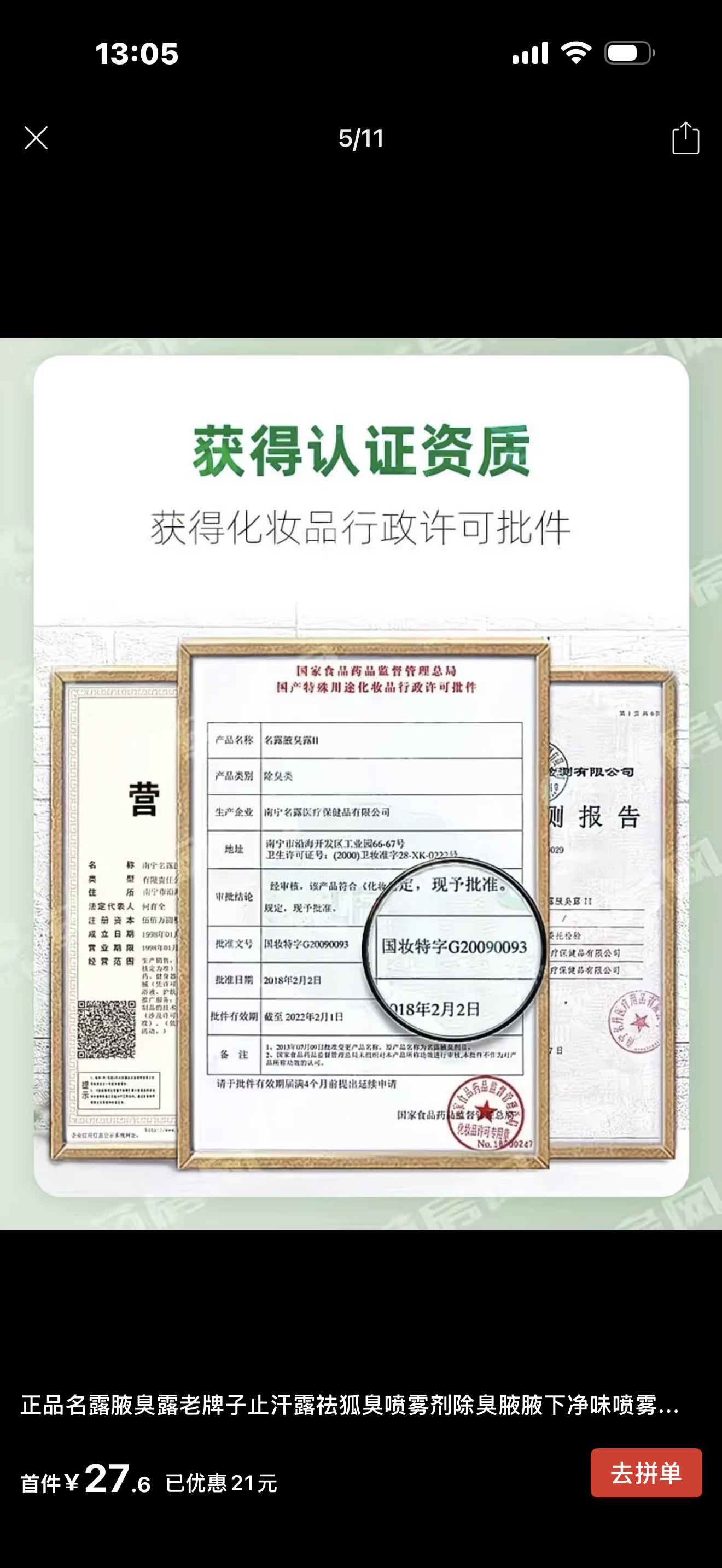 記者查看該產(chǎn)品的參數(shù)發(fā)現(xiàn),頁(yè)面顯示其化妝品批準(zhǔn)文號(hào)為“國(guó)妝特字G20090093”,生產(chǎn)日期為2025年1月6日,功能為“去狐臭,除臭”,適用膚質(zhì)為“多種膚質(zhì)”。隨后,記者通過(guò)化妝品監(jiān)管APP對(duì)該批號(hào)進(jìn)行查詢(xún),結(jié)果顯示產(chǎn)品名稱(chēng)為“名露腋臭露Ⅱ”(原名為“名露腋臭劑Ⅱ”),生產(chǎn)企業(yè)為南寧名露醫(yī)療保健品有限公司。該批準(zhǔn)文號(hào)的批準(zhǔn)日期為2018年2月2日,有效期至2022年2月1日,當(dāng)前顯示為“已過(guò)期”,并附有備注說(shuō)明“國(guó)家食品藥品監(jiān)督管理總局未組織對(duì)本產(chǎn)品所稱(chēng)功效進(jìn)行審核,本批件不作為對(duì)產(chǎn)品所稱(chēng)功效的認(rèn)可”。備注中還指出“根據(jù)《化妝品監(jiān)督管理?xiàng)l例》規(guī)定,該產(chǎn)品可銷(xiāo)售至2025年12月31日,逾期不得生產(chǎn)、進(jìn)口、銷(xiāo)售”。