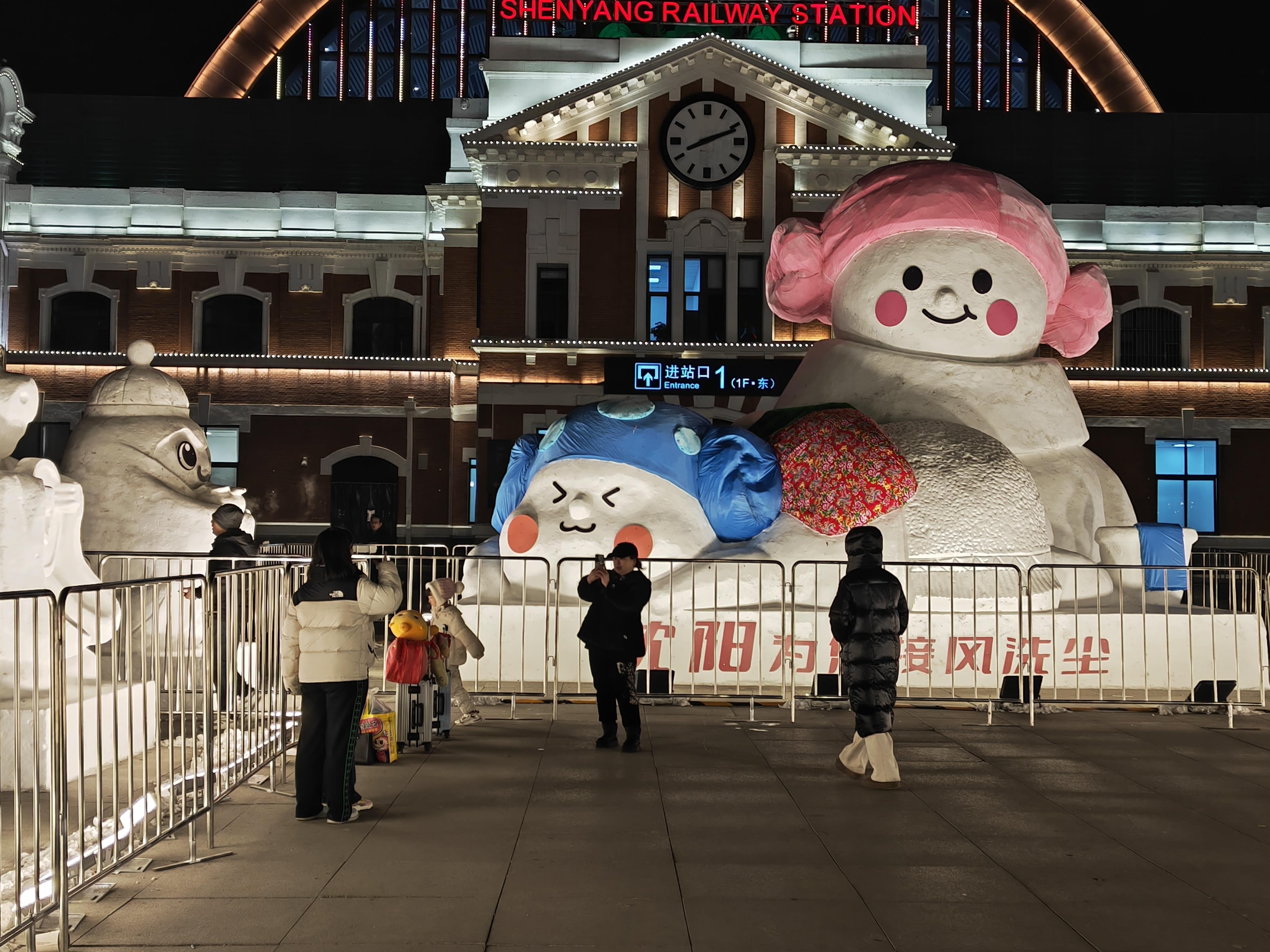 1月21日20時(shí),沈陽站東廣場進(jìn)出口旅客絡(luò)繹不絕,當(dāng)?shù)貧鉁匾呀抵亮阆?0攝氏度。行色匆匆的人們驚喜地看到廣場中央新建成的巨型搓澡雪人家族雪雕以及排隊(duì)“搓澡”的十二生肖雪雕格外顯眼,大家紛紛將行李箱推至一旁,專注地拍照留念。