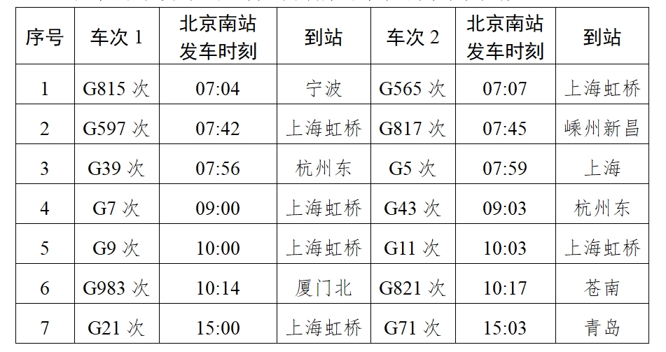 充分發(fā)揮北京地區(qū)路網(wǎng)優(yōu)勢,6對(duì)京滬高鐵動(dòng)車組列車始發(fā)終到站由北京南站變更為北京站,延伸至北京站的京滬高鐵列車由4對(duì)增加至6對(duì),為旅客提供更多選擇。