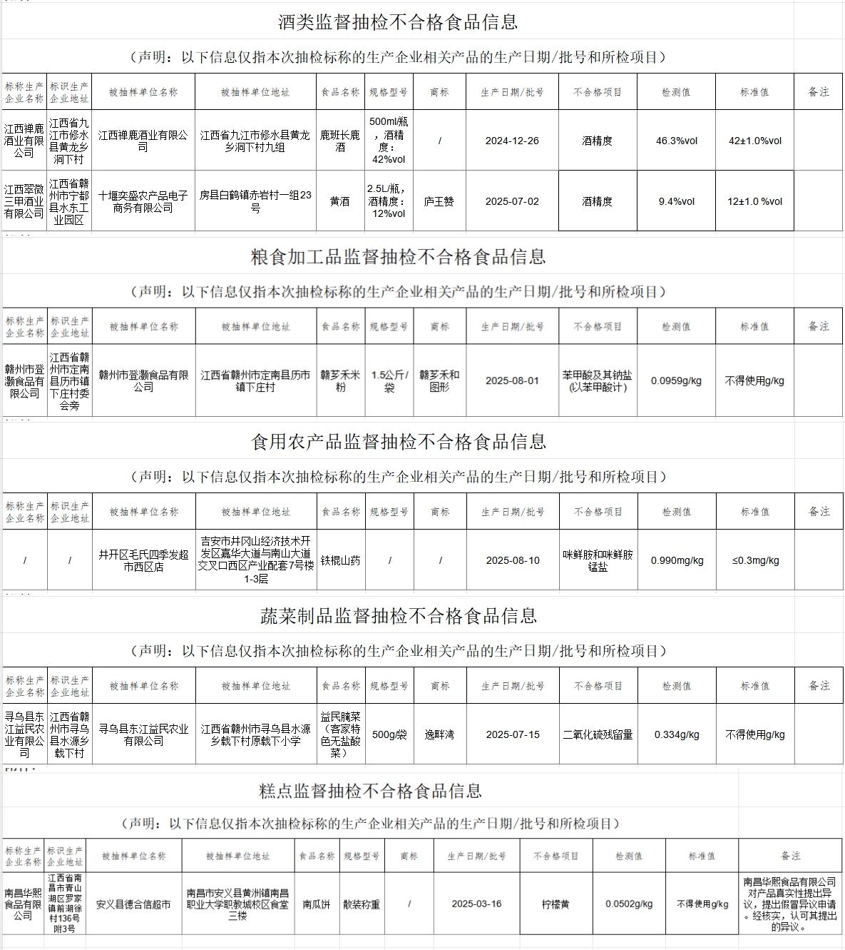 根據(jù)《中華人民共和國(guó)食品安全法》及其實(shí)施條例等有關(guān)規(guī)定和江西省食品安全監(jiān)督抽檢計(jì)劃安排,省市場(chǎng)監(jiān)督管理局近期組織開展了食品安全監(jiān)督抽檢,抽取保健食品、餐飲食品、炒貨食品及堅(jiān)果制品、淀粉及淀粉制品、糕點(diǎn)、酒類、冷凍飲品、糧食加工品、食用農(nóng)產(chǎn)品、蔬菜制品10大類食品,檢出6批次不合格。