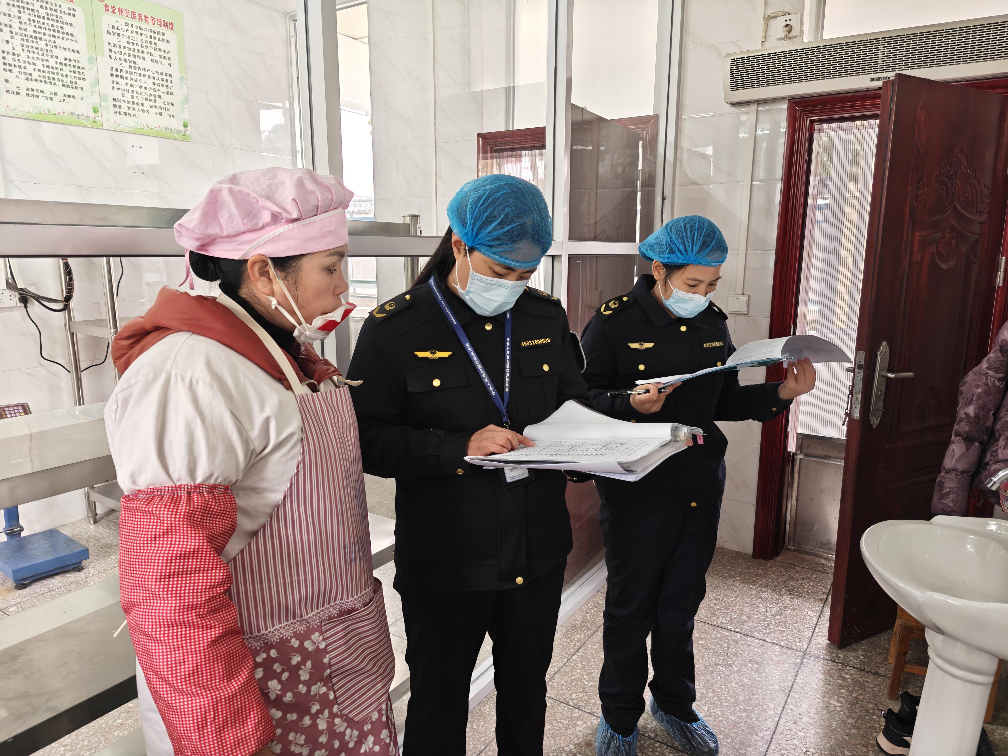 執(zhí)法人員檢查學(xué)校食堂食材購進(jìn)臺賬。龍勝縣市場監(jiān)管局供圖