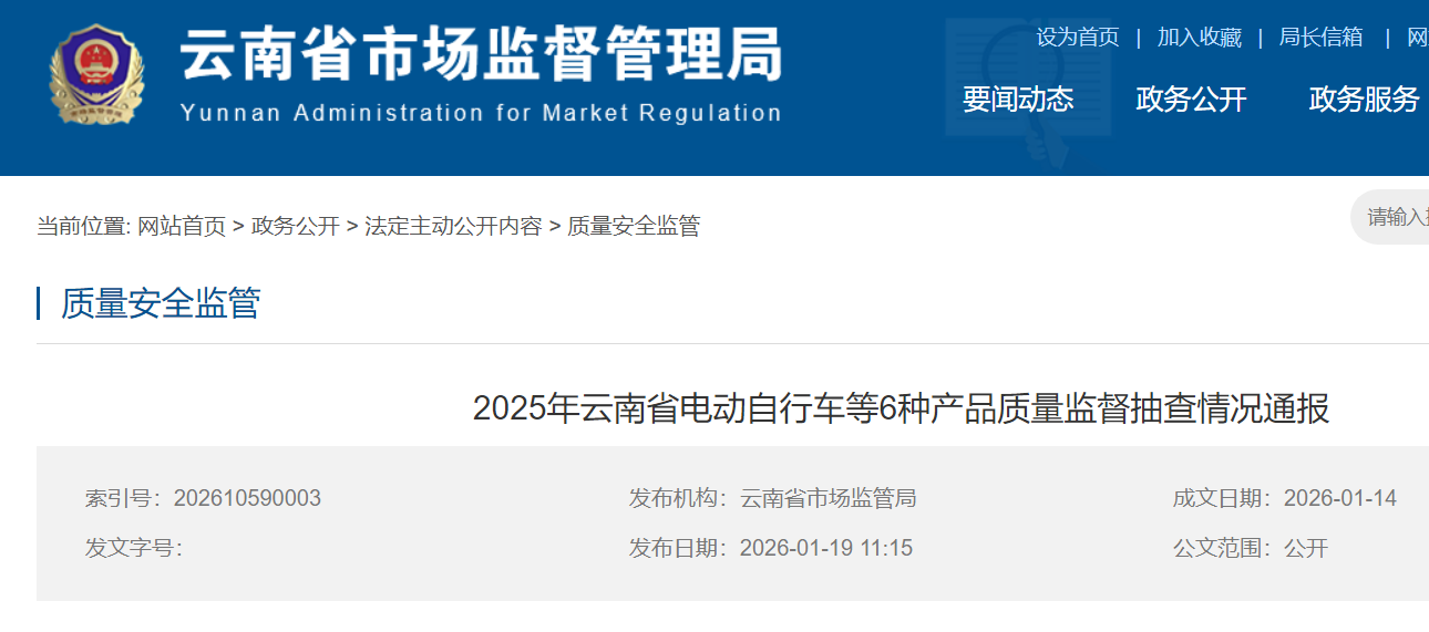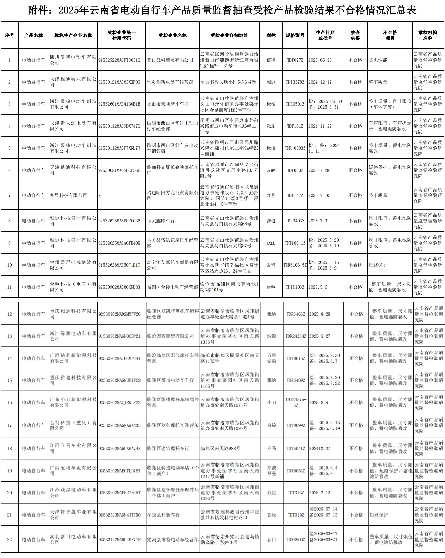 【附件:2025年云南省電動自行車產(chǎn)品質(zhì)量監(jiān)督抽查受檢產(chǎn)品檢驗結(jié)果不合格情況匯總表.pdf】