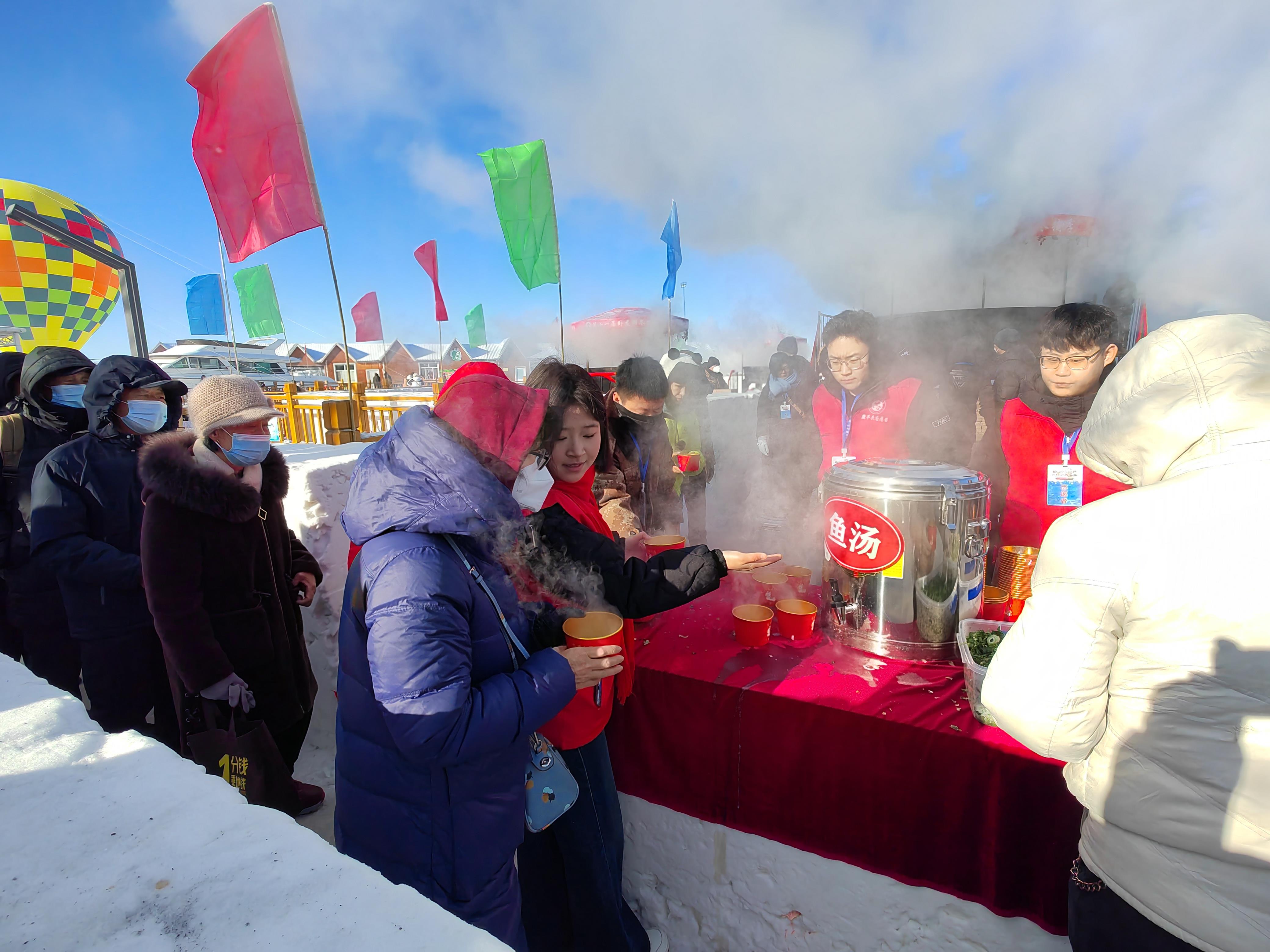 1月24日9時(shí)許,記者趕到康橋廣場(chǎng)時(shí),距離今年冬捕正式開(kāi)幕尚有一段時(shí)間?;顒?dòng)場(chǎng)地內(nèi)免費(fèi)品嘗“天下第一鍋”燉魚(yú)湯的隊(duì)伍,已經(jīng)排得幾乎一眼望不到邊。身穿紅色馬甲的冬捕青年志愿者,為排長(zhǎng)龍隊(duì)伍的人們依次端上一碗冒著熱氣的鮮魚(yú)湯。服務(wù)臺(tái)還有貼心備好的香菜、蔥花等調(diào)味料,游客可任選,全部免費(fèi)提供。