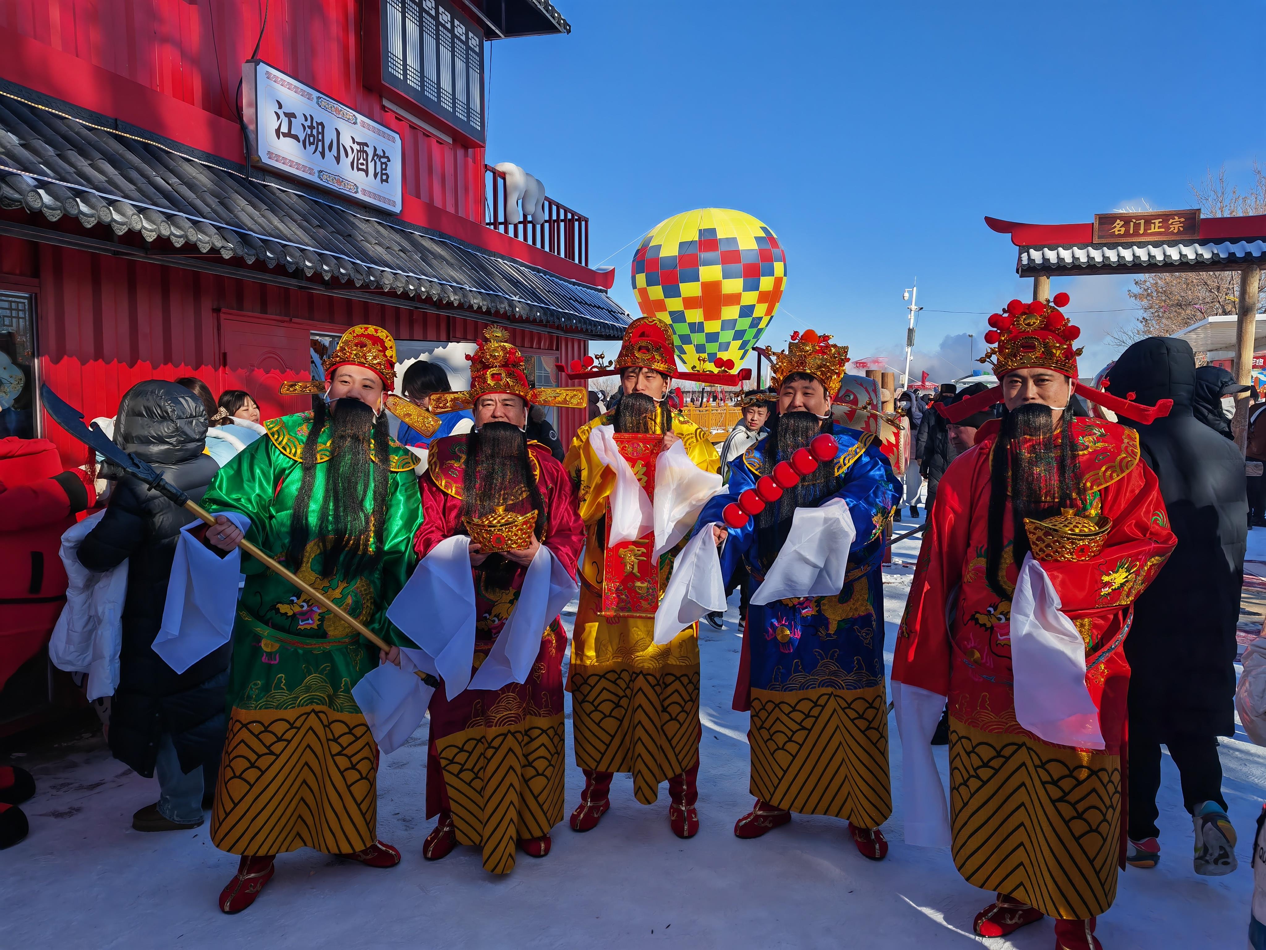 位于大鍋魚(yú)湯品嘗區(qū)不遠(yuǎn)處的《江湖小酒館》沉浸劇場(chǎng),以“自己演自己”的互動(dòng)模式,讓游客深度融入歷史場(chǎng)景,實(shí)現(xiàn)文化體驗(yàn)從觀看到參與的轉(zhuǎn)變。劇場(chǎng)門(mén)外,“五位財(cái)神”現(xiàn)身,與游客熱情互動(dòng)之余,還送上“招財(cái)進(jìn)寶”的美好祝福,幾位游客興致盎然,情不自禁地亮出各自的趣味招式與“財(cái)神們”合影,畫(huà)面和諧又熱鬧。