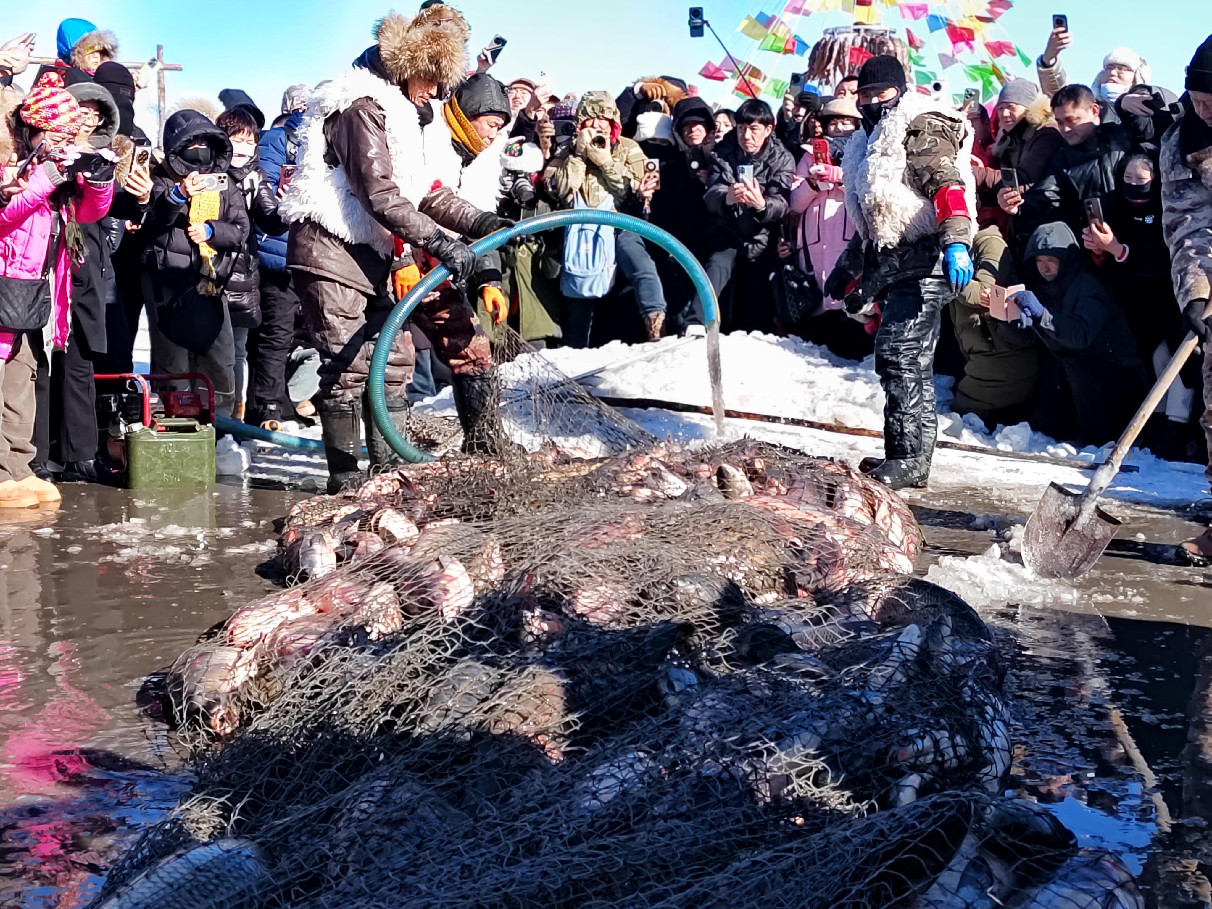 祭湖醒網(wǎng)、破冰下網(wǎng)等傳統(tǒng)儀式在開(kāi)幕式上完整呈現(xiàn),身著遼代服飾的表演者再現(xiàn)千年漁獵盛景,與冰封湖面的背景相映成趣。作為遼金文化“捺缽”漁獵傳統(tǒng)的延續(xù),今年冬捕季深度挖掘歷史內(nèi)涵,讓古老民俗在當(dāng)代煥發(fā)新生。