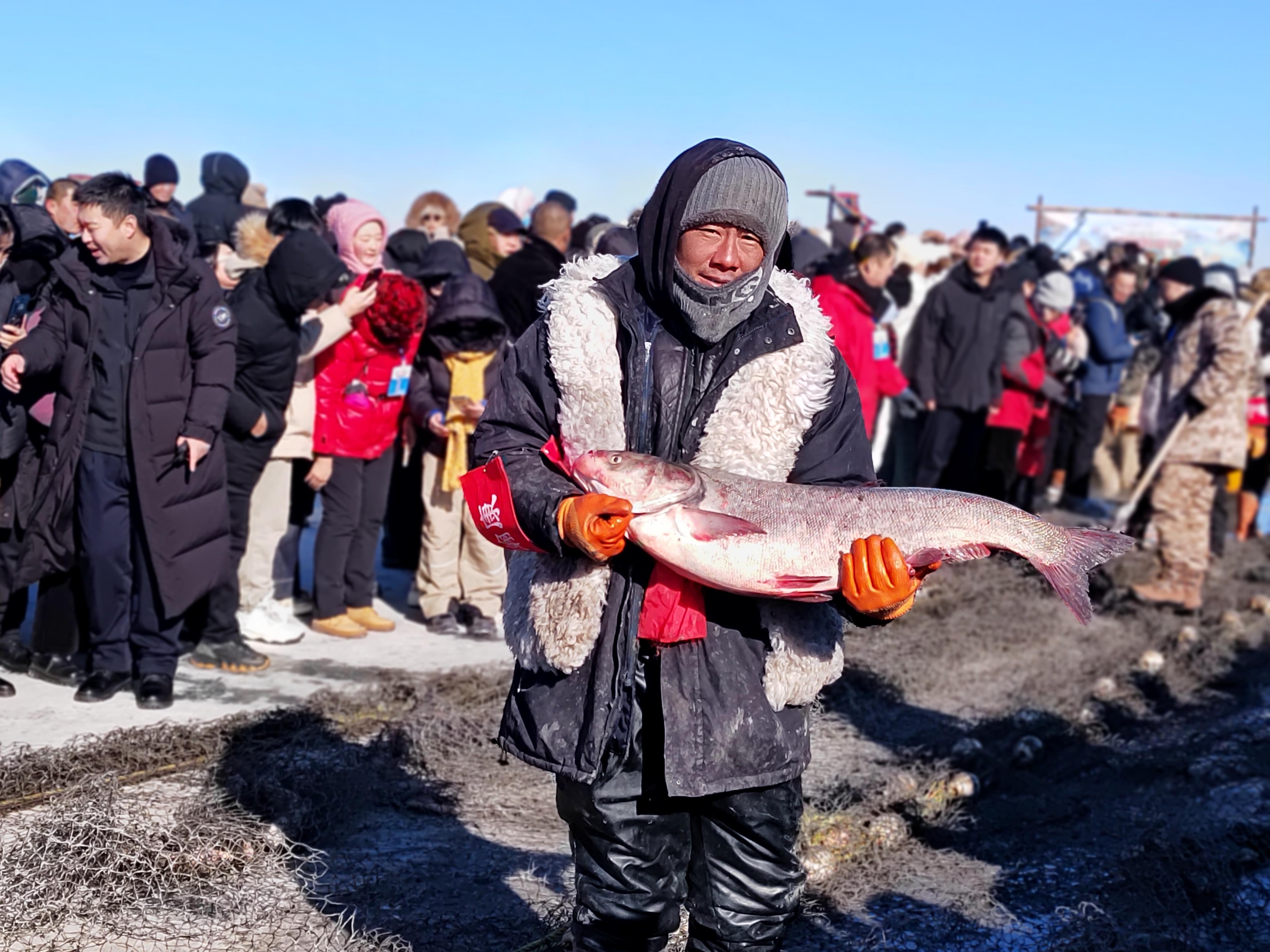 當(dāng)一張巨型漁網(wǎng)從冰窟窿里被緩緩?fù)铣觯О贄l肥碩的胖頭魚(yú)、白鰱魚(yú)、鯉魚(yú)扎堆“躍”上冰面,冬捕的氛圍此刻在湖面達(dá)到頂峰,千年漁獵嗨翻冬日。