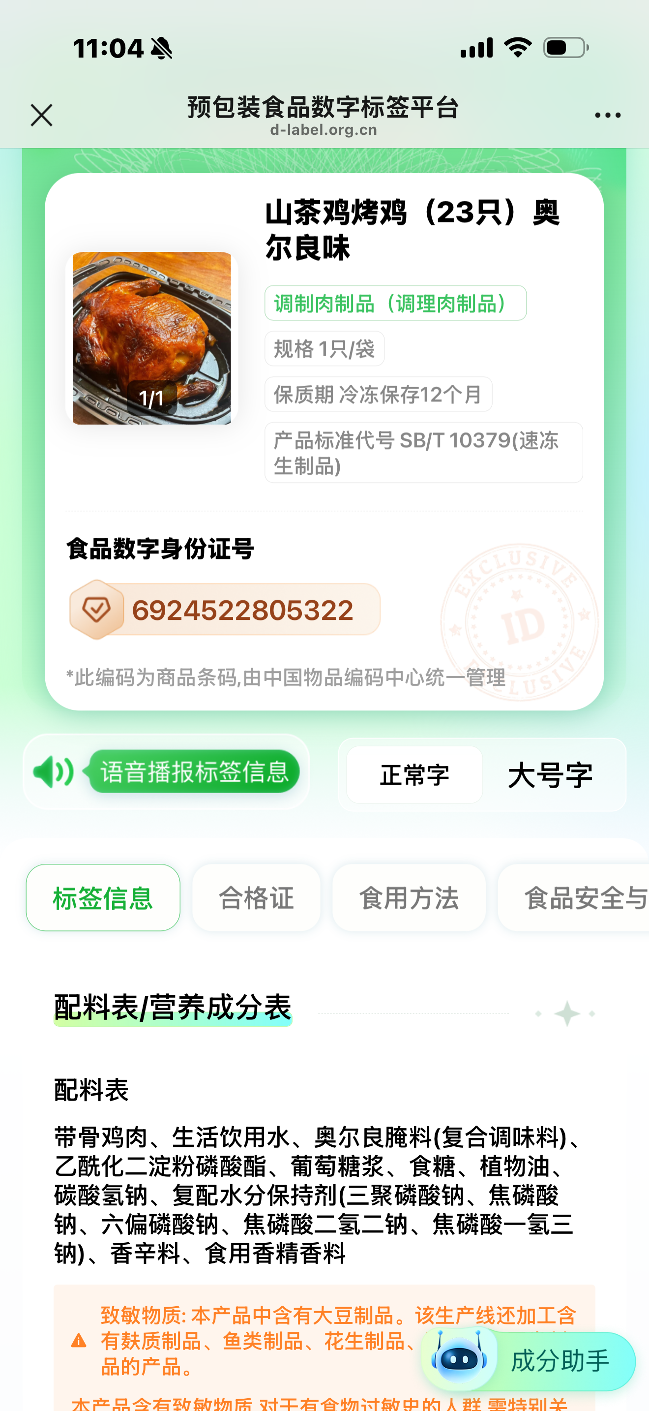 除了信息展示,數(shù)字標簽還能可視化展示生產(chǎn)過程。例如,一只速凍山茶雞烤雞,掃碼后能找到詳細烹飪方法,還能通過視頻直觀了解從原料養(yǎng)殖、生產(chǎn)加工到冷鏈運輸?shù)娜湕l過程,相關(guān)資質(zhì)證書也清晰可查,消費體驗更加立體真實。