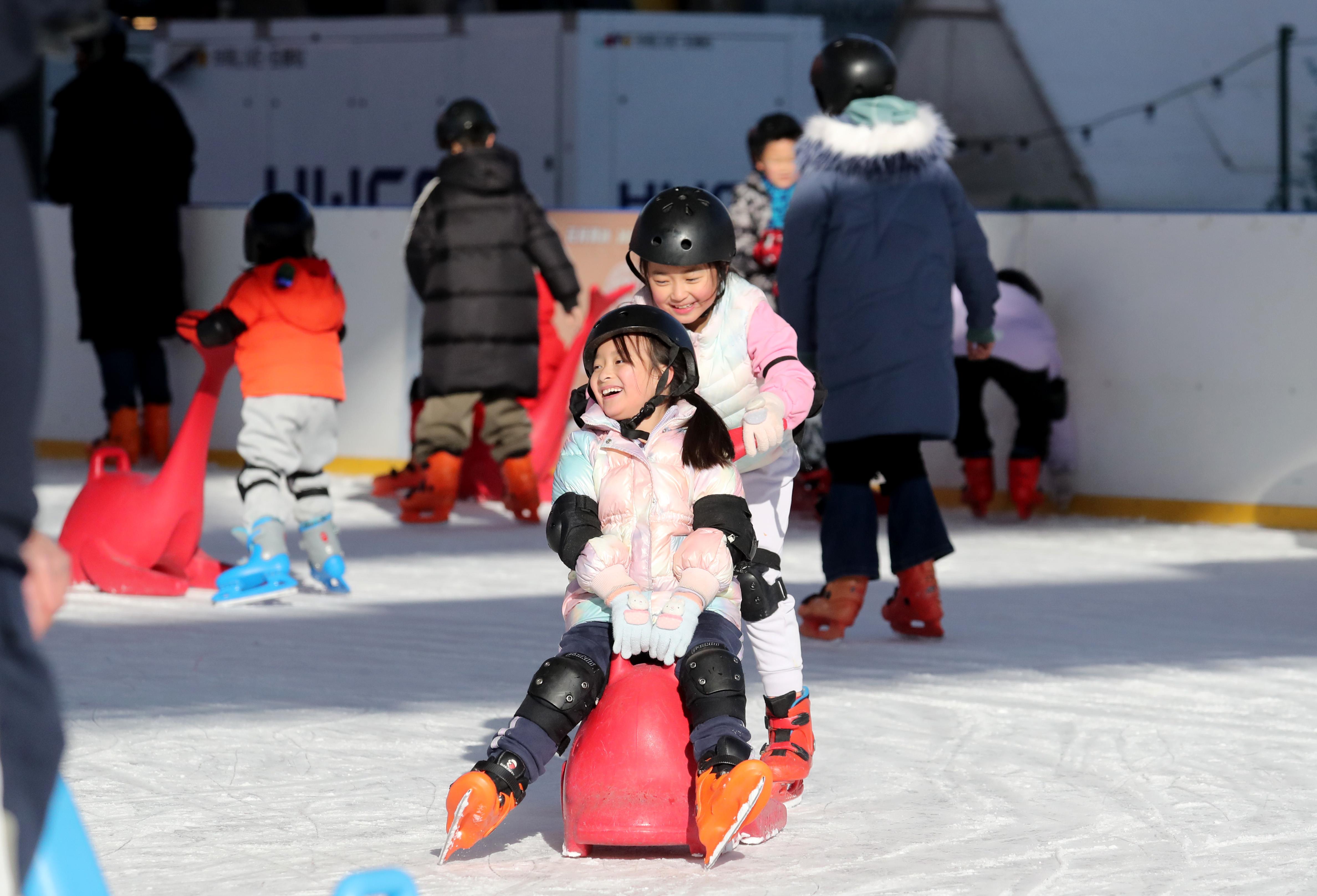 小朋友們正在體驗(yàn)滑冰的樂趣。
