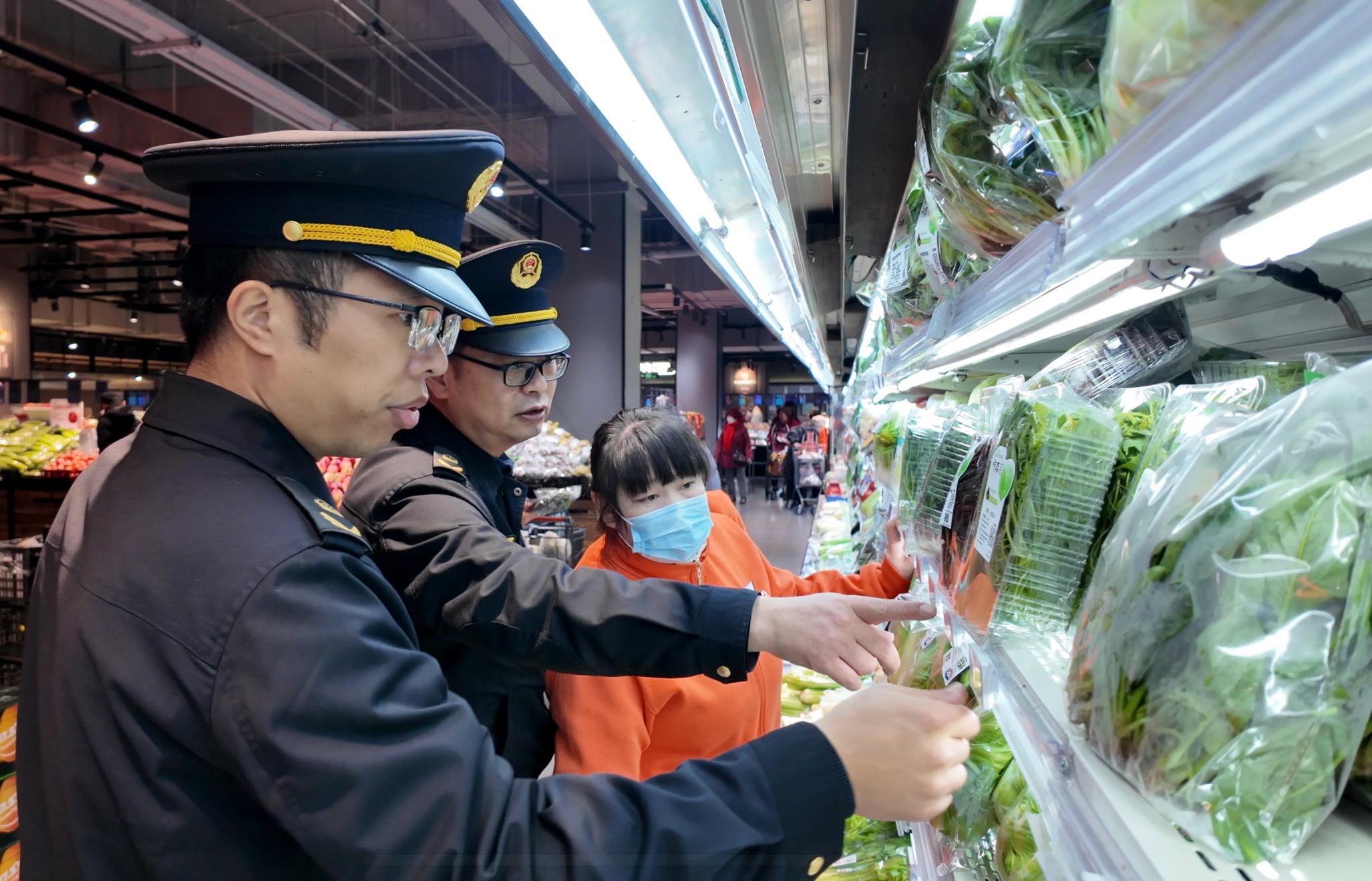 執(zhí)法人員對蔬菜價格進行檢查時的情景。張寒羽/攝
