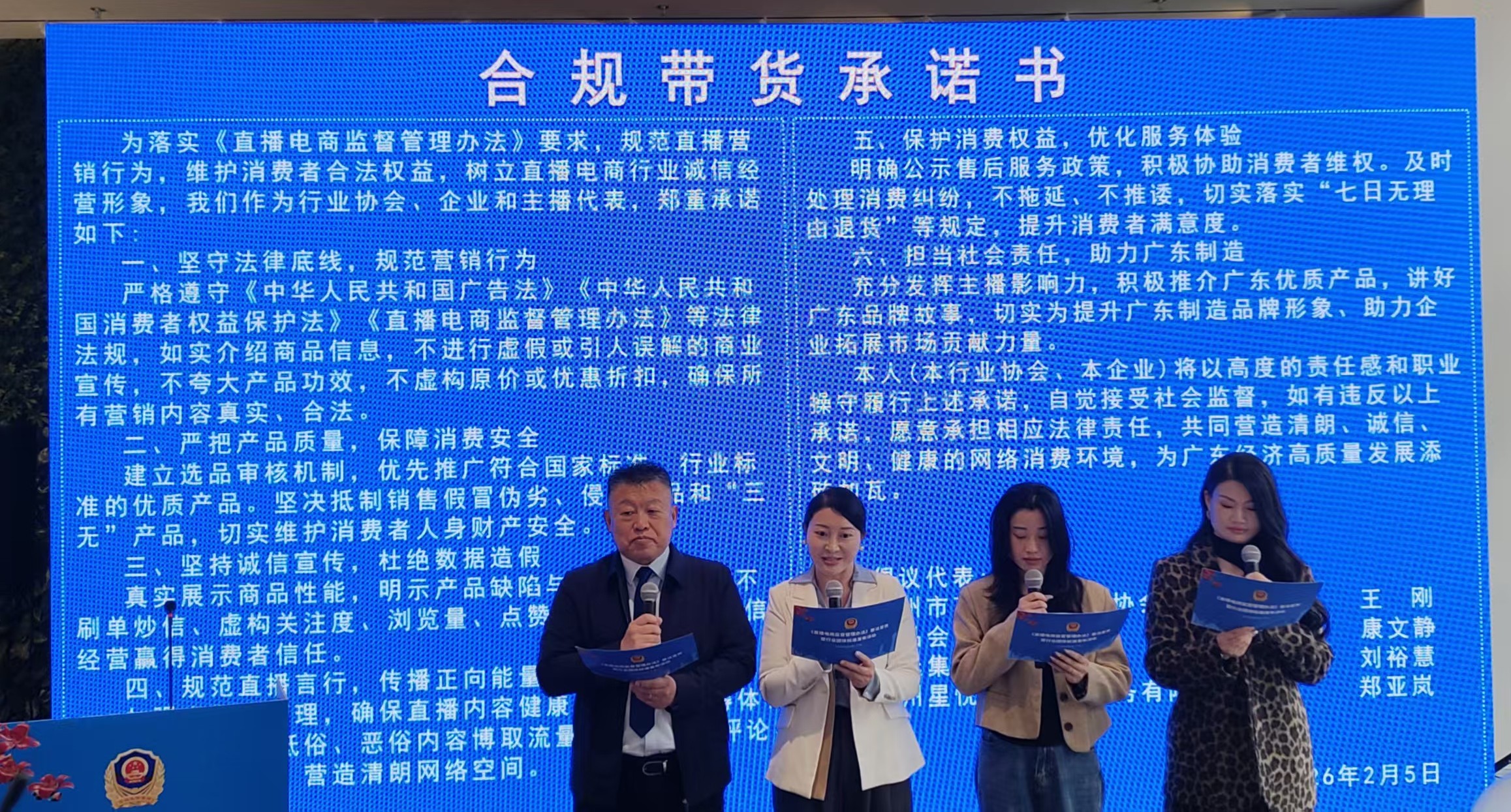 活動現(xiàn)場,廣州市直播電商協(xié)會聯(lián)合主播代表發(fā)起合規(guī)帶貨承諾,承諾將堅守法律底線,嚴(yán)把產(chǎn)品質(zhì)量關(guān),優(yōu)化消費服務(wù)體驗,切實保障消費者合法權(quán)益,自覺接受社會大眾與行業(yè)監(jiān)管的監(jiān)督。