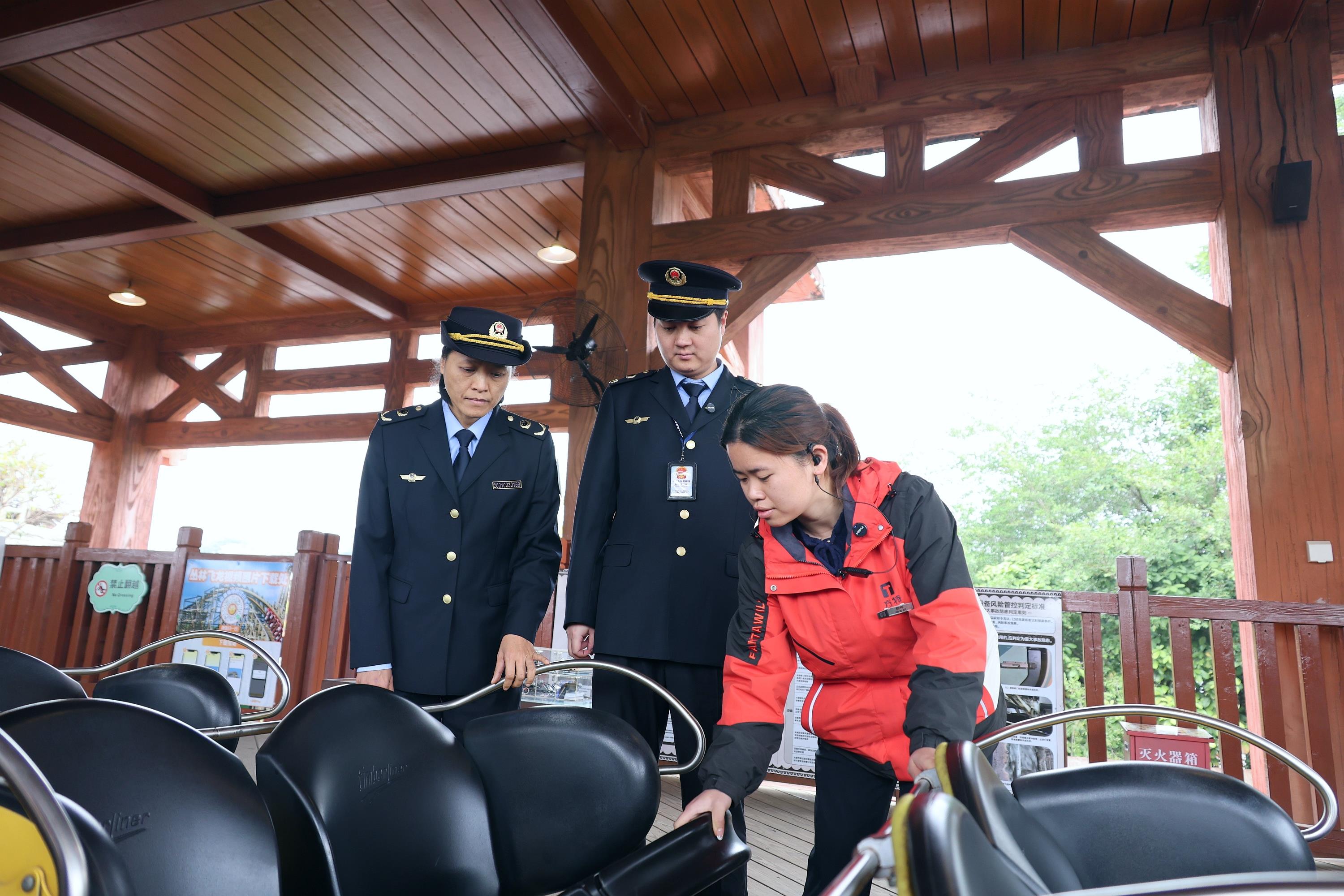 執(zhí)法人員檢查大型游樂設(shè)施(叢林飛龍)的設(shè)備安全情況。南寧市市場監(jiān)管局供圖