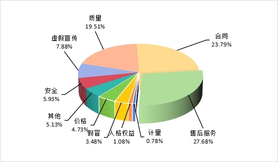 根據(jù)投訴性質(zhì),售后服務(wù)問(wèn)題占27.68%,合同問(wèn)題占23.79%,質(zhì)量問(wèn)題占19.51%,虛假宣傳問(wèn)題占7.88%,安全問(wèn)題占5.93%,價(jià)格問(wèn)題占4.73%,假冒問(wèn)題占3.48%,人格權(quán)益問(wèn)題占1.08%,計(jì)量問(wèn)題占0.78%,其他問(wèn)題占5.13%。與2024年相比,假冒、虛假宣傳、合同問(wèn)題投訴比重上升,售后服務(wù)、質(zhì)量、其他問(wèn)題投訴比重下降。