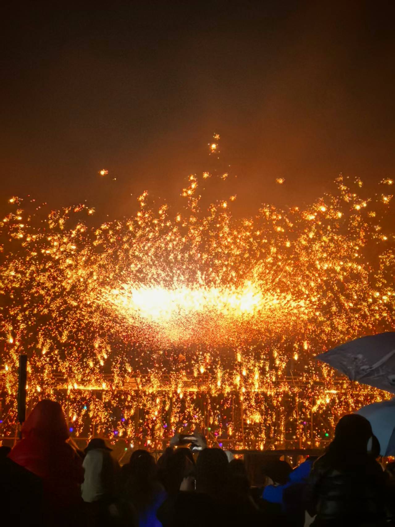 記者看到,打鐵花表演現(xiàn)場早已搭起高臺,臺上三盆烈火在夜幕下熊熊燃燒,暖意撲面而來。游客們扶老攜幼、有序駐足,臉上滿是熱切的期盼。據(jù)主持人介紹,打鐵花被譽(yù)為古代的“煙花”,是一項(xiàng)集高溫冶煉、體能技巧、藝術(shù)表現(xiàn)于一體的千年非遺絕技?!按蜩F花啰!”伴隨著高亢激昂的音樂,主持人一聲長嘯,表演正式拉開帷幕。只見表演者手持工具舀起滾燙的鐵水,奮力擊打間,1600攝氏度的鐵水騰空而起、驟然綻放,化作漫天金雨,璀璨奪目,夜空瞬間被映照得如同白晝,現(xiàn)場觀眾的驚嘆聲和歡呼聲此起彼伏,不絕于耳?!暗谝淮维F(xiàn)場看打鐵花,太震撼了!這才是最動(dòng)人的非遺魅力?!庇慰蛷埮坎煌5赜檬謾C(jī)記錄,臉上滿是驚喜。