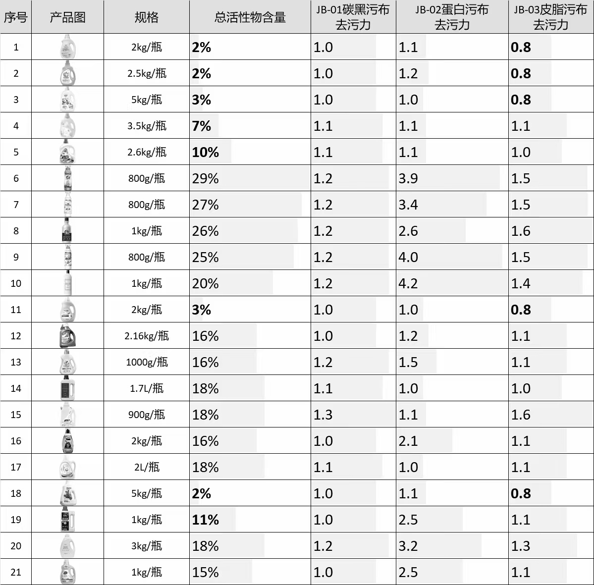 本次去污力檢測(cè)還針對(duì)JB-01、JB-02、JB-03三種規(guī)定污布開(kāi)展,分別對(duì)應(yīng)油漬、蛋白漬、人體分泌的皮脂漬三類(lèi)。按照QB/T 1224—2012《衣料用液體洗滌劑》要求,普通型洗衣液對(duì)三種規(guī)定污布的去污力應(yīng)不低于標(biāo)準(zhǔn)洗衣液的相應(yīng)指標(biāo)值(測(cè)試結(jié)果表格中體現(xiàn)為≥1.0)。根據(jù)標(biāo)準(zhǔn)全面評(píng)估21款樣品的實(shí)際清潔能力,檢測(cè)結(jié)果仍然呈現(xiàn)出兩極分化的特點(diǎn)。