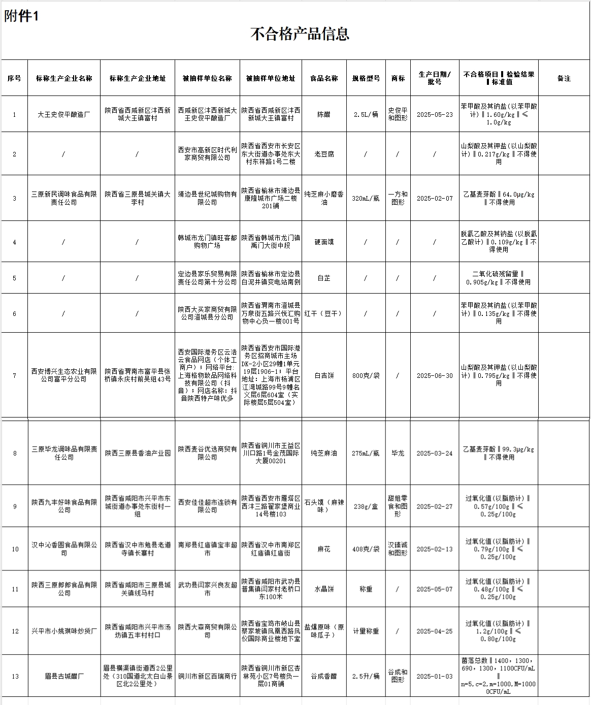 陜西省市場監(jiān)督管理局組織的食品安全監(jiān)督抽檢中,檢出13批次樣品不合格。產(chǎn)品抽檢結(jié)果可查詢https://spcjsac.gsxt.gov.cn/。