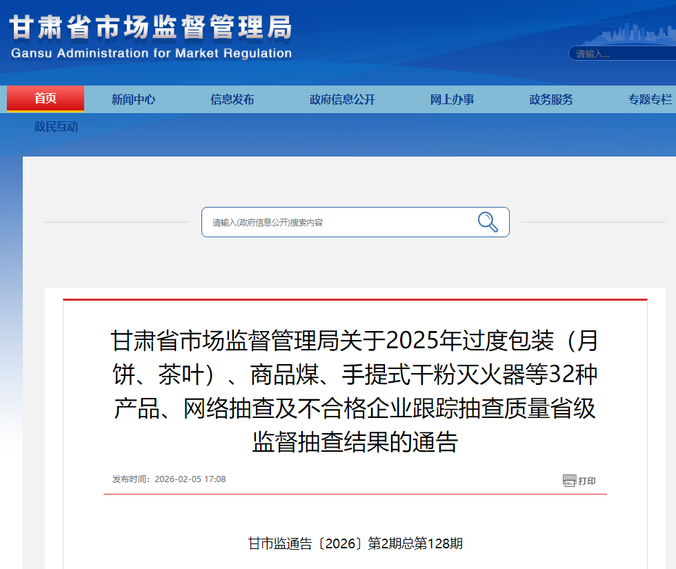 2025年三、四季度,甘肅省市場監(jiān)督管理局對過度包裝(月餅、茶葉)、商品煤、手提式干粉滅火器等32種產(chǎn)品、網(wǎng)絡(luò)抽查及不合格企業(yè)跟蹤抽查組織開展了產(chǎn)品質(zhì)量省級監(jiān)督抽查。現(xiàn)將有關(guān)抽查情況通告如下: