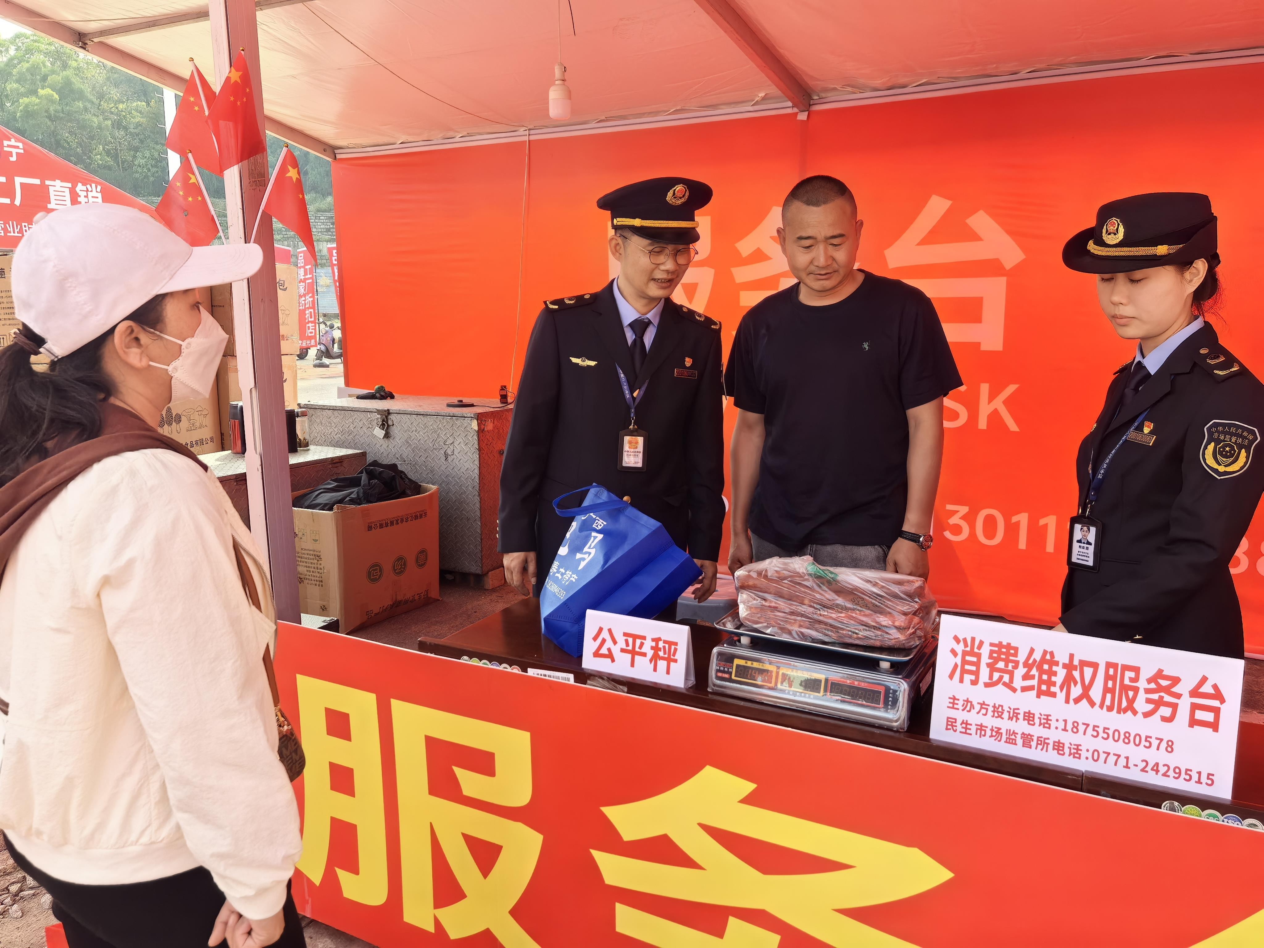 在年貨市場(chǎng)入口處,興寧區(qū)市場(chǎng)監(jiān)管局設(shè)置有公平秤和消費(fèi)維權(quán)服務(wù)臺(tái)?!坝辛斯匠?,買東西更放心了!”消費(fèi)者李女士提著買的臘腸,特意到公平秤上復(fù)稱,看到重量絲毫不差,滿意地點(diǎn)了點(diǎn)頭。