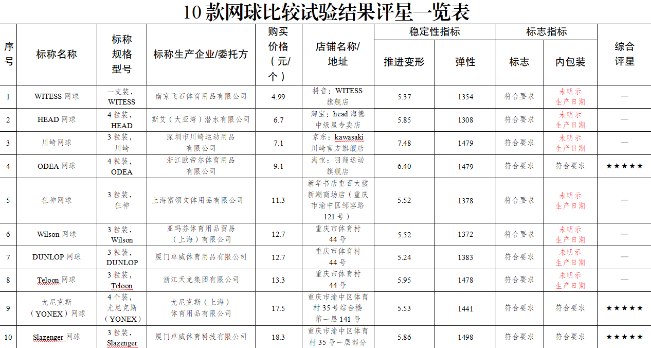 中國消費(fèi)者報重慶訊(記者劉文新)近日,重慶市消費(fèi)者權(quán)益保護(hù)委員會公布10款網(wǎng)球比較試驗(yàn)結(jié)果,其中,標(biāo)稱品牌為ODEA、Slazenger、尤尼克斯的3款樣品的兩類測試指標(biāo)均達(dá)到相關(guān)國家標(biāo)準(zhǔn)要求,綜合表現(xiàn)優(yōu)秀,被評為五星。標(biāo)稱品牌為WITESS、HEAD、川崎、狂神等7款樣品的內(nèi)包裝沒有標(biāo)注生產(chǎn)日期,不符合標(biāo)準(zhǔn)要求,未參與評星。