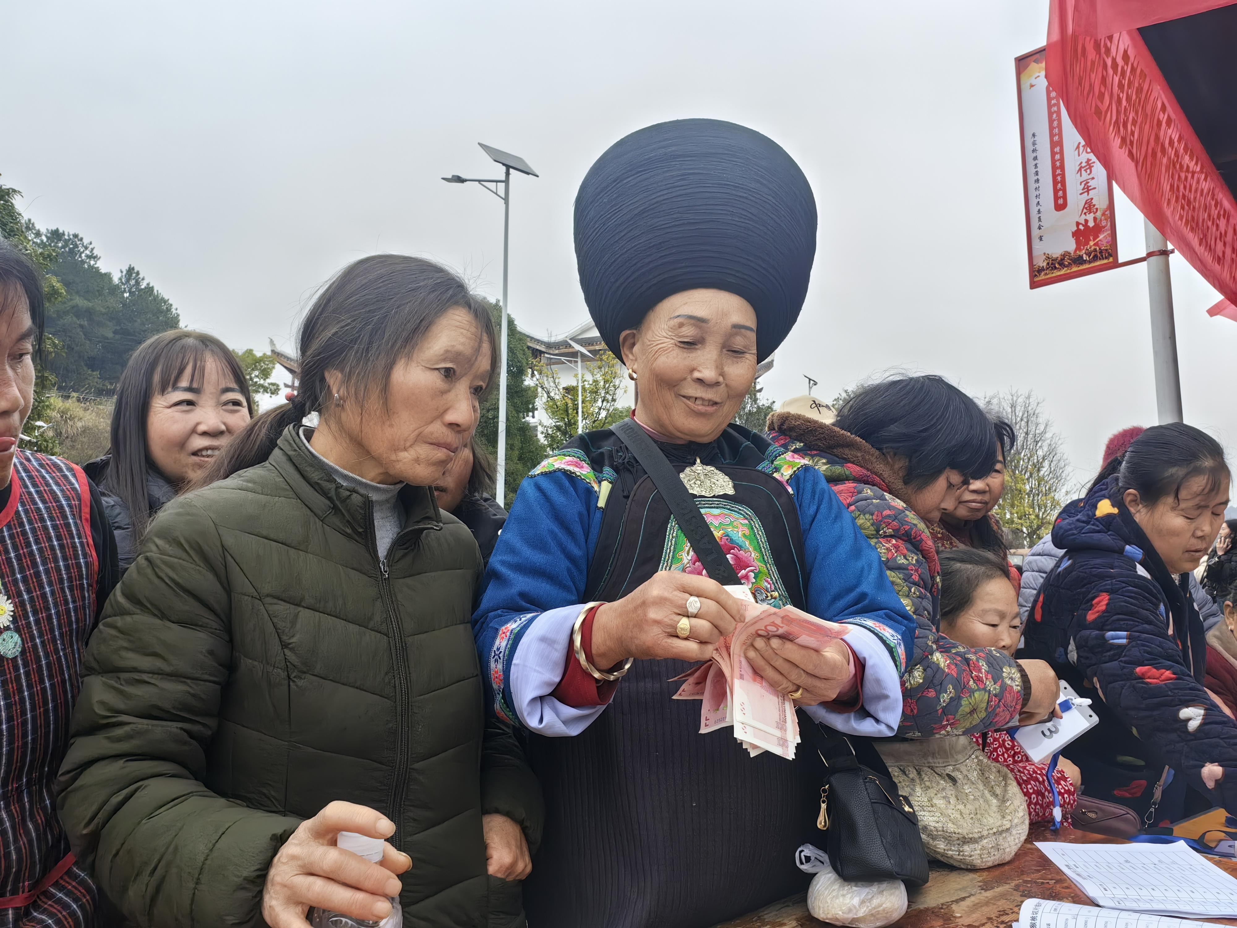 在村部廣場一側(cè)的民族團(tuán)結(jié)交流亭前,幾張長桌拼在一起,上面整整齊齊碼放著一沓沓嶄新的百元大鈔。紅色的鈔票在冬日的陽光下顯得格外耀眼。這是村里合作社和企業(yè)為村民們發(fā)放的工資。